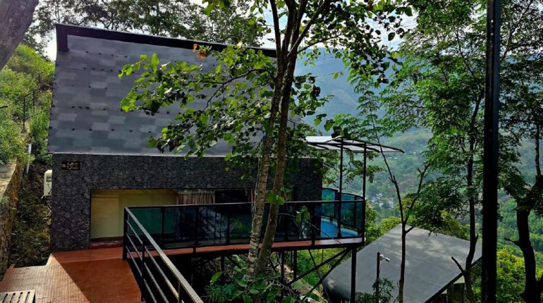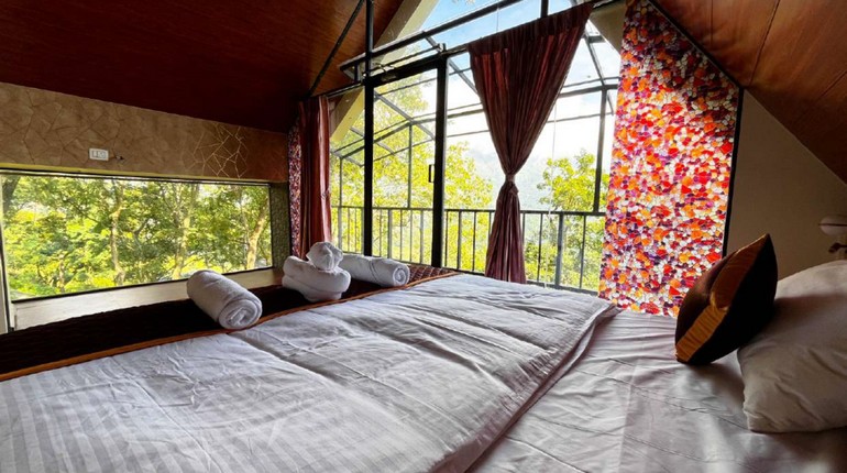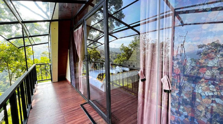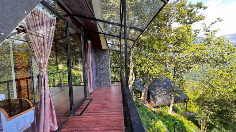 Floor-to-ceiling windows frame the breathtaking landscape, allowing soft light and mountain air to flow effortlessly through the space. The minimalist architecture creates an open yet cozy atmosphere, while natural textures and subtle tones echo the calm rhythm of the hills.